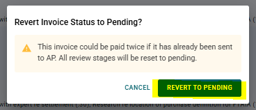 If the invoice has already been exported to Accounts Payable or marked as paid, verify the payment status with your AP team before reverting it to Pending to avoid duplicate payments.