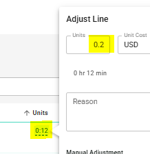 If you click on the time value shown under Units, a small pop-up window will appear displaying the decimal unit value.