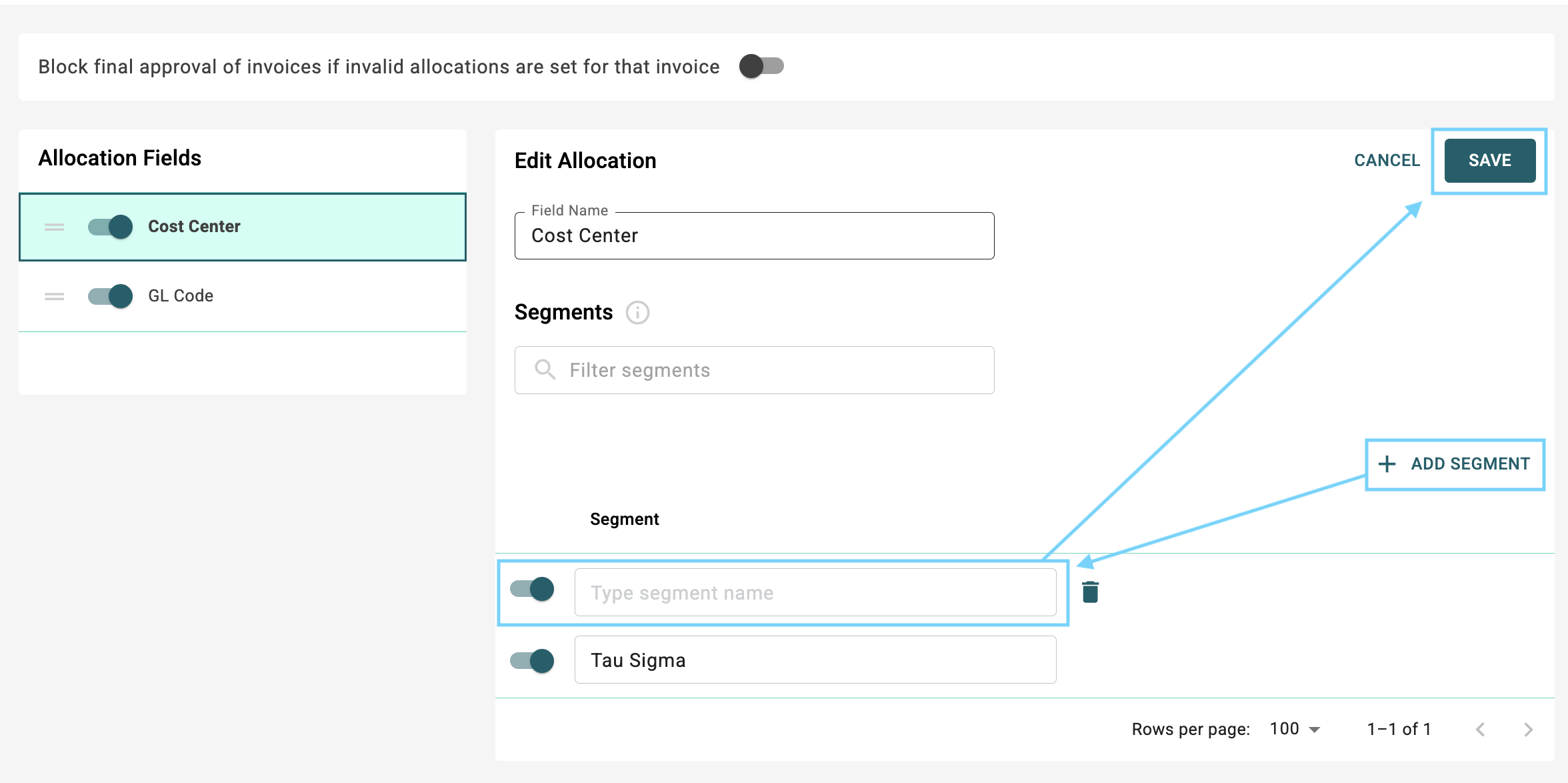 | 3. Define the Allocation Parameters: | - Name the allocation (e.g., Cost Center, Entity Code, Department Code, GL Code, etc.). - Add at least one segment (you can add multiple). - Click Create to finalize the setup. |