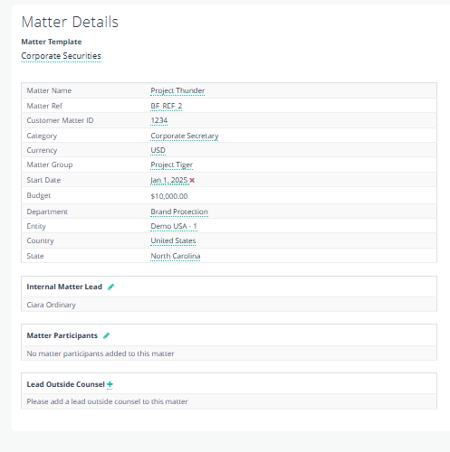 Displays core & custom matter fields, templates, and participants.